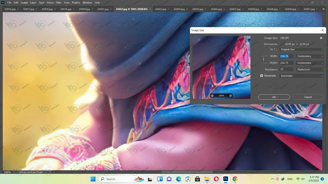• ابعاد فایل(سانتیمتر و پیکسل) و رزولوشن عکس در تصویر دوم قابل مشاهده میباشد.تصویر بزرگتر نشان دهنده کیفیت تصویر با ابعاد استاندارد برای چاپ میباشد.تصویر کوچکتر نشان دهنده کیفیت عکس در حالت بزرگنمایی 100 در 100 میباشد.