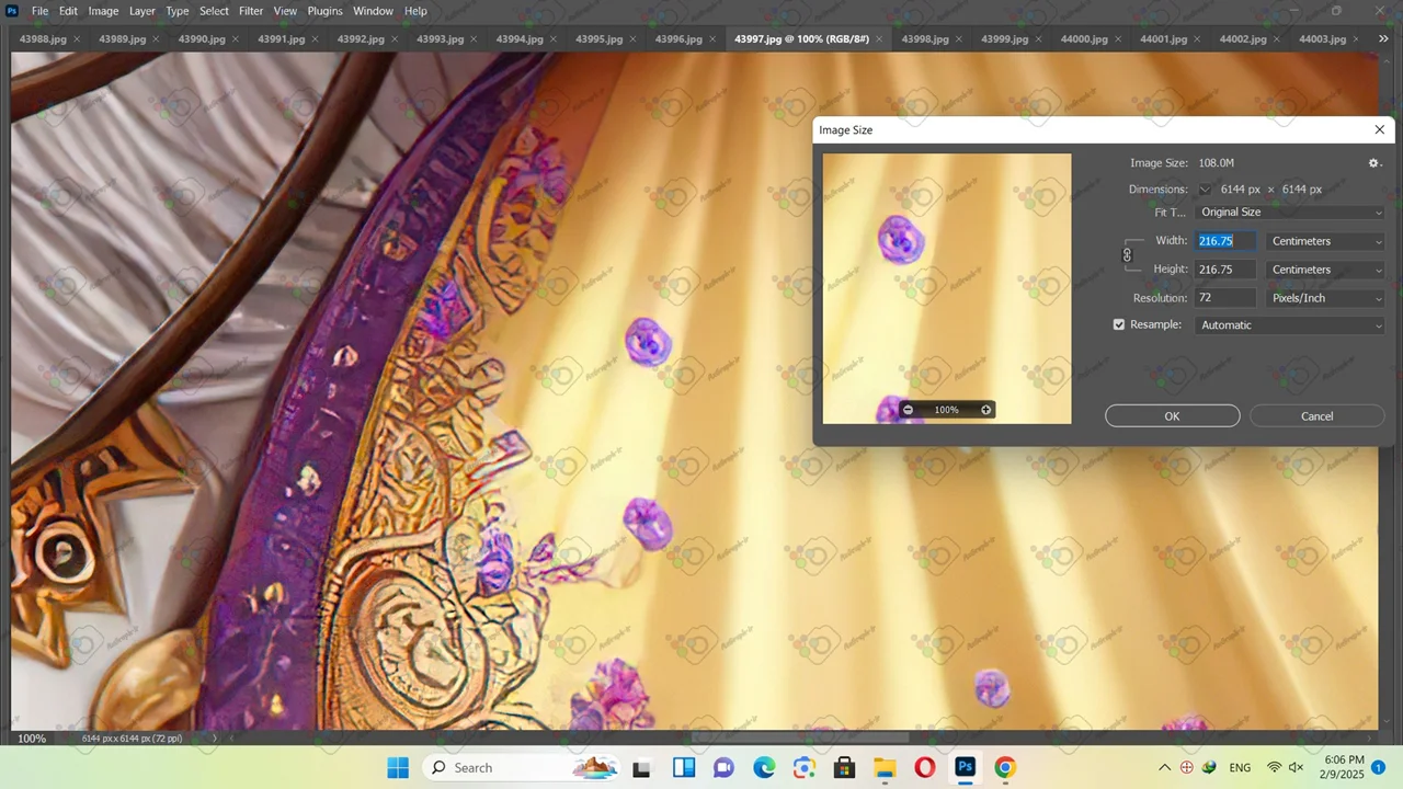 • ابعاد فایل(سانتیمتر و پیکسل) و رزولوشن عکس در تصویر دوم قابل مشاهده میباشد.تصویر بزرگتر نشان دهنده کیفیت تصویر با ابعاد استاندارد برای چاپ میباشد.تصویر کوچکتر نشان دهنده کیفیت عکس در حالت بزرگنمایی 100 در 100 میباشد.