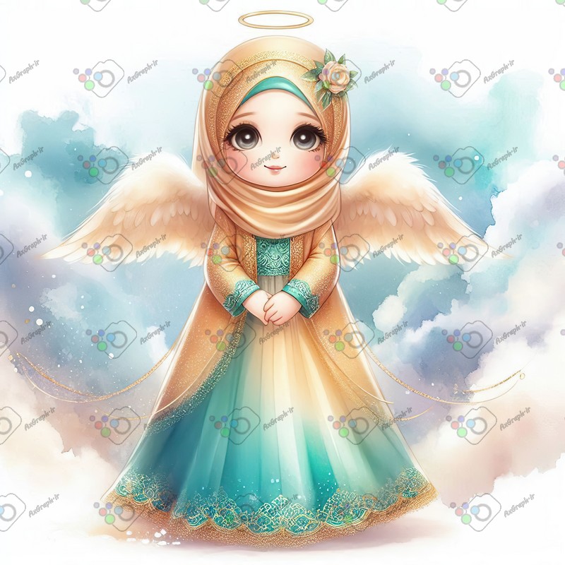 بک گراند کودکانه فرشته ناز با حجاب با لباس طلایی و فیروزه ای روی ابرها-کد 44250(ویژه عکس گراف)