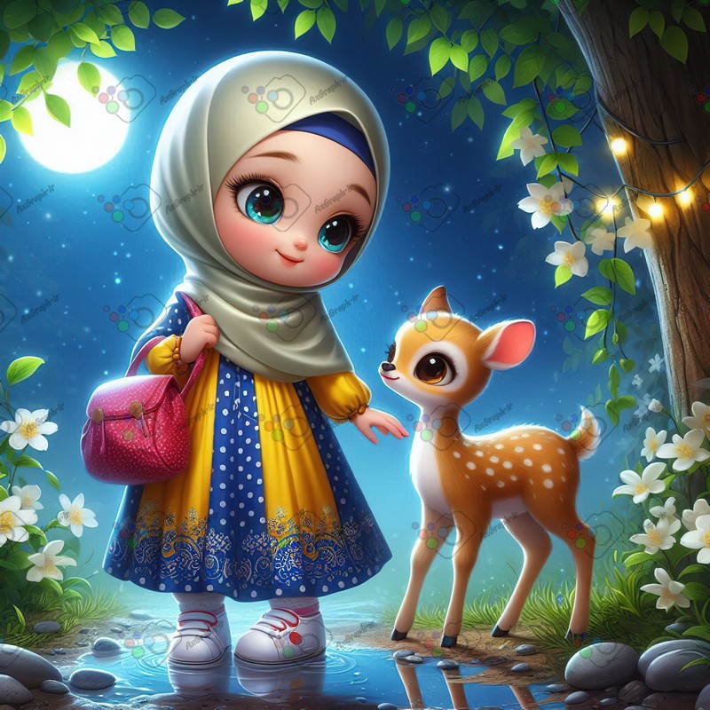 بک گراند کودکانه دختر کوچولوی ناز با حجاب و بچه آهوی دوست داشتنی زیر نور مهتاب-کد 44264(ویژه عکس گراف)