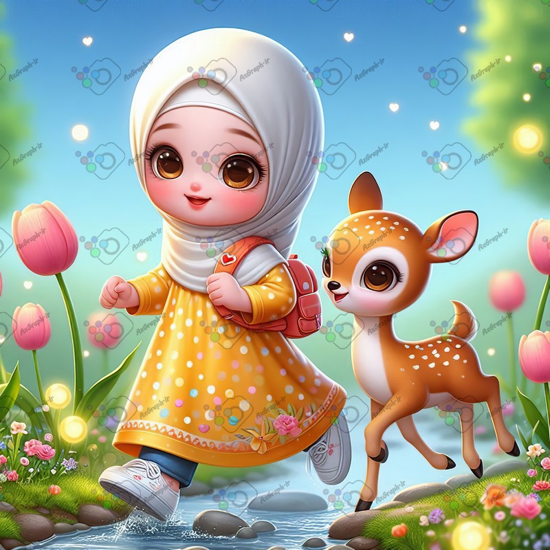 بک گراند کودکانه دختر کوچولوی ناز با حجاب و بچه آهوی دوست داشتنی در حال عبور از چشمه-کد 44266(ویژه عکس گراف)