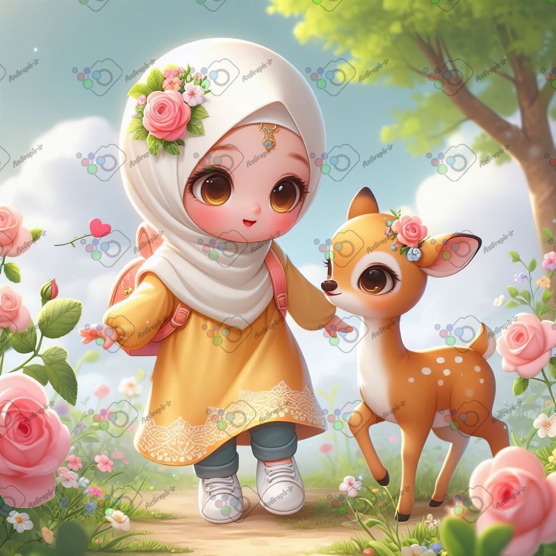 بک گراند کودکانه دختر کوچولوی ناز با حجاب و بچه آهوی دوست داشتنی در باغ رز صورتی-کد 44269(ویژه عکس گراف)