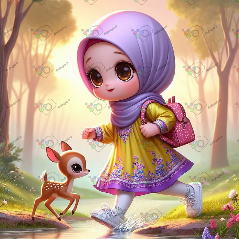 بک گراند کودکانه دختر کوچولوی ناز با حجاب و بچه آهوی دوست داشتنی در حال عبور از جنگل-کد 44273(ویژه عکس گراف)