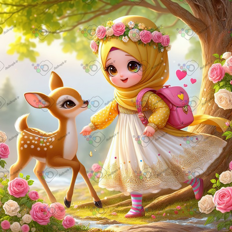 بک گراند کودکانه دختر کوچولوی ناز با حجاب با تاج گل و بچه آهوی دوست داشتنی در جنگل گل رز-کد 44279(ویژه عکس گراف)