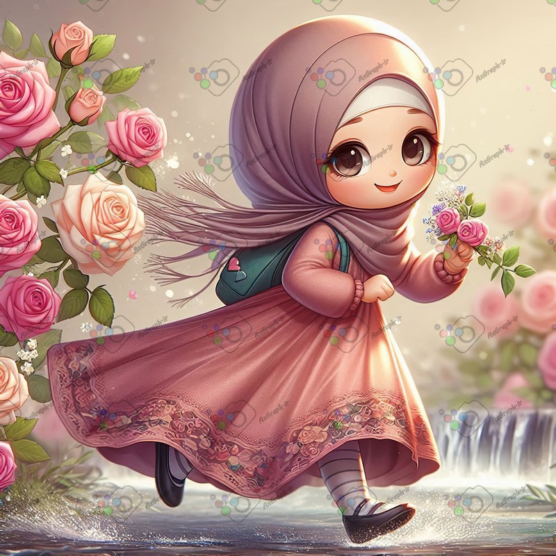 بک گراند کودکانه دختر کوچولوی ناز با حجاب در حال دویدن در باغ گل رز-کد 44281(ویژه عکس گراف)