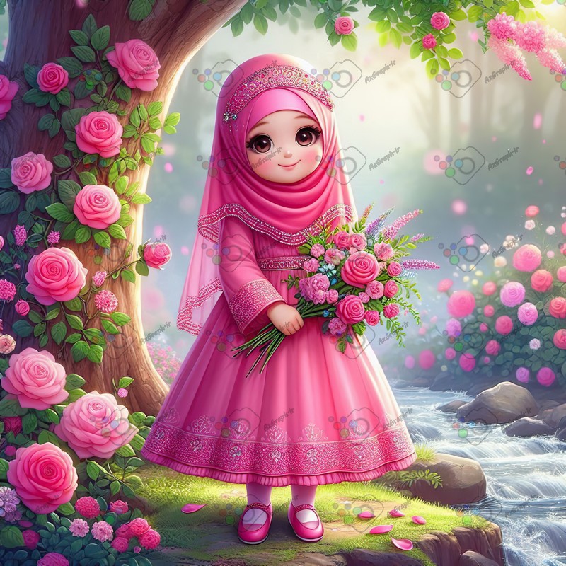 بک گراند کودکانه دختر کوچولوی ناز با حجاب با دسته گل ایستاده زیر درخت رز صورتی-کد 44282(ویژه عکس گراف)