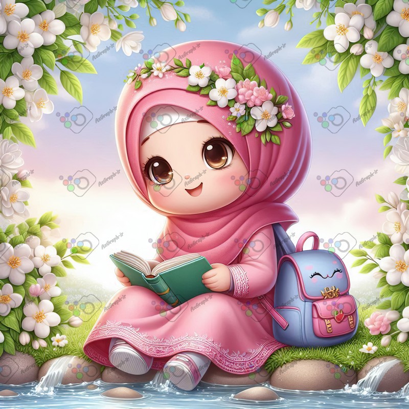 بک گراند کودکانه دختر کوچولوی ناز با حجاب با کوله خندان در حال کتاب خواندن در باغ یاس سپید-کد 44284(ویژه عکس گراف)