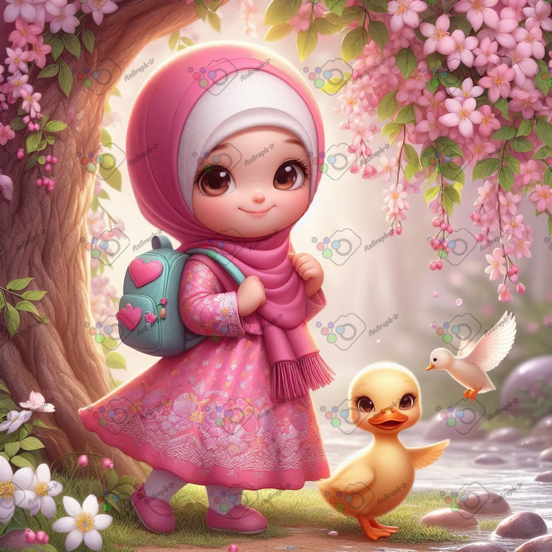 بک گراند کودکانه دختر کوچولوی ناز با حجاب با اردک با مزه زیر درخت یاس صورتی-کد 44290(ویژه عکس گراف)