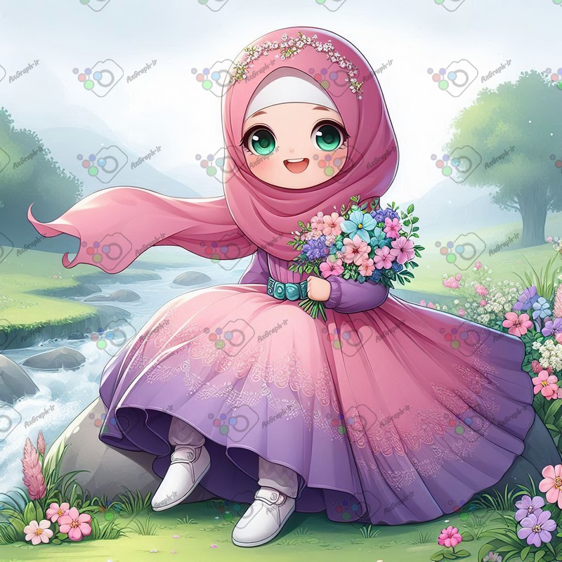 بک گراند کودکانه دختر کوچولوی ناز با حجاب با دسته گل رنگارنگ نشسته روی تخته سنگ-کد 44292(ویژه عکس گراف)