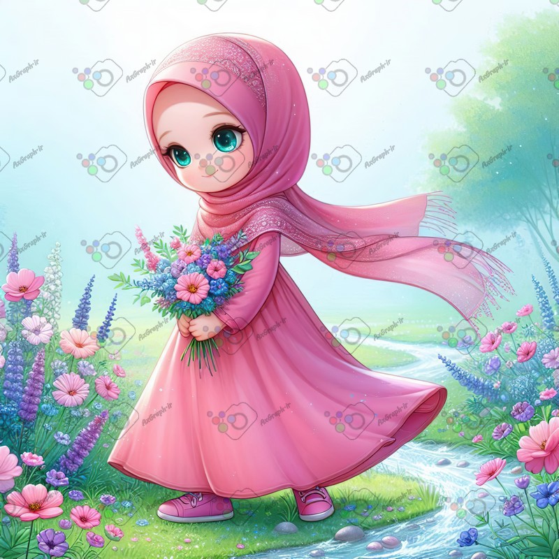بک گراند کودکانه دختر کوچولوی ناز با حجاب با دسته گل صورتی و بنفش کنار رود در دشت گلها-کد 44293(ویژه عکس گراف)
