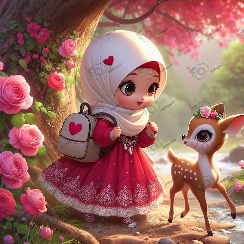 بک گراند کودکانه دختر کوچولوی ناز با حجاب و آهوی گل به سر در باغ رز-کد 44297(ویژه عکس گراف)