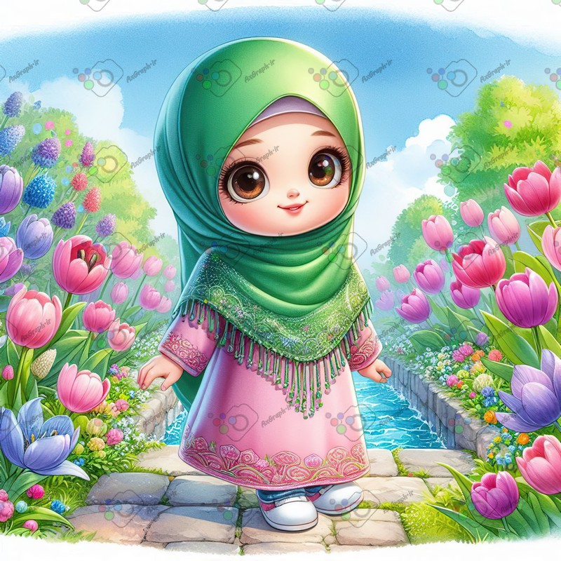 بک گراند کودکانه دختر کوچولوی ناز با حجاب ایستاده در باغ لاله ها-کد 44304(ویژه عکس گراف)