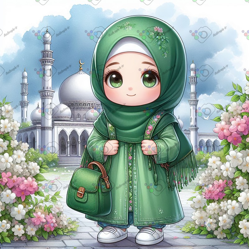 بک گراند کودکانه دختر کوچولوی ناز با حجاب با کیف دستی و کوله جلوی مسجد-کد 44314(ویژه عکس گراف)