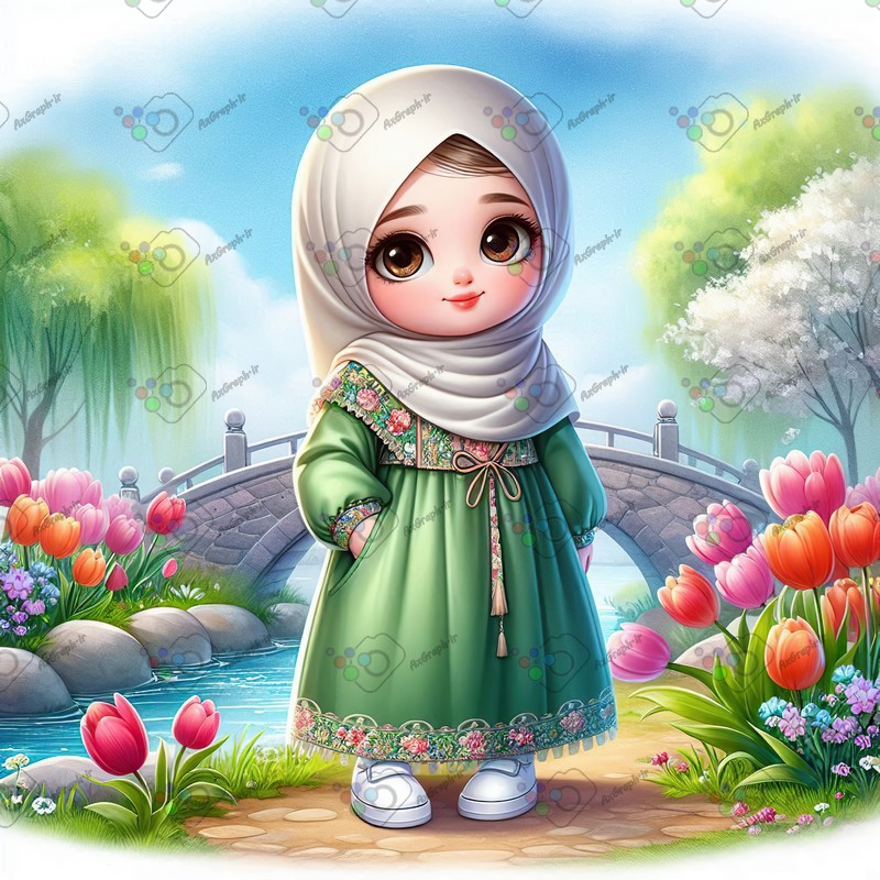 بک گراند کودکانه دختر کوچولوی ناز با حجاب جلوی پل سنگی در باغ لاله ها-کد 44316(ویژه عکس گراف)