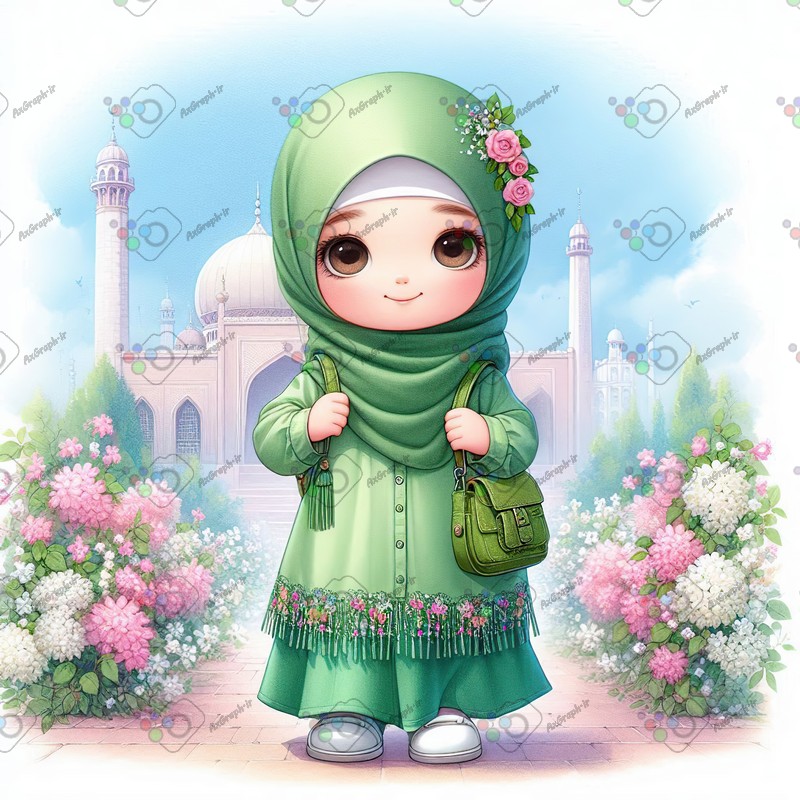 بک گراند کودکانه دختر کوچولوی ناز با حجاب ایستاده میان گلهای یاس جلوی مسجد-کد 44317(ویژه عکس گراف)
