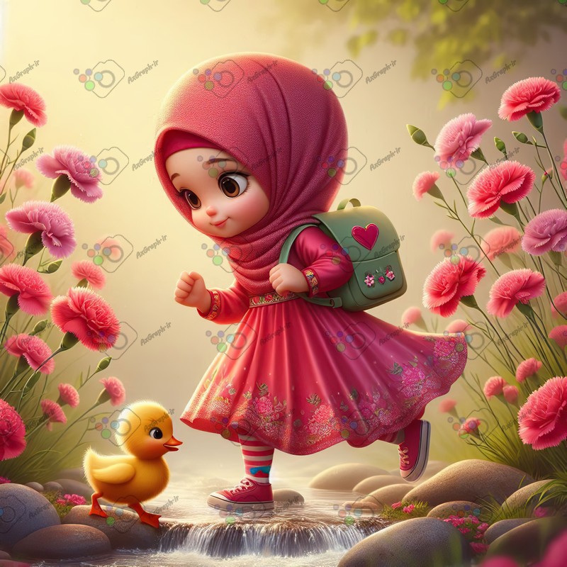 بک گراند کودکانه دختر کوچولوی ناز با حجاب و اردک بازیگوش در باغ میخک-کد 44324(ویژه عکس گراف)