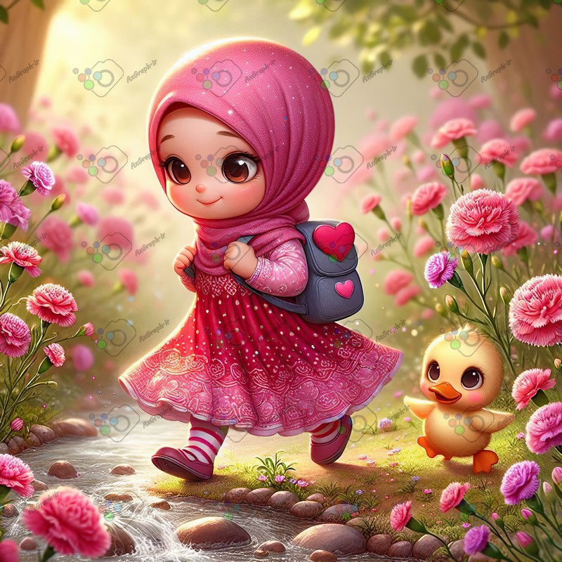 بک گراند کودکانه دختر کوچولوی ناز با حجاب و اردک با نمک در حال عبور از باغ میخک-کد 44327(ویژه عکس گراف)