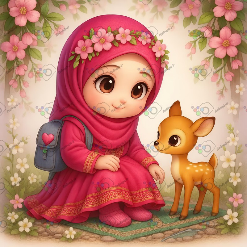 بک گراند کودکانه دختر کوچولوی ناز با حجاب و بچه آهوی با مزه در باغ گلها-کد 44329(ویژه عکس گراف)