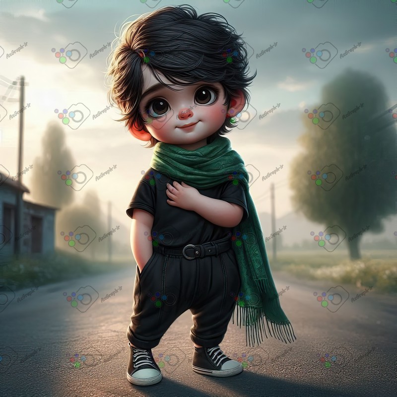 بک گراند کودکانه پسر بچه با لباس مشکی و شال سبز در جاده -کد 44373(ویژه عکس گراف)