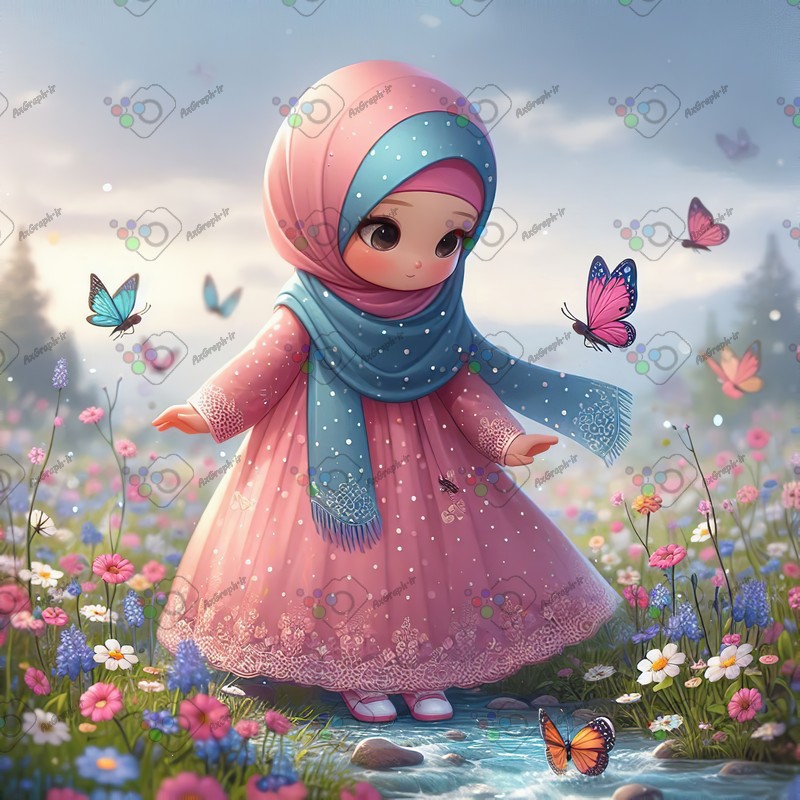 بک گراند کودکانه دختر بچه ناز با حجاب و پروانه ها در دشت گلها-کد 44375(ویژه عکس گراف)