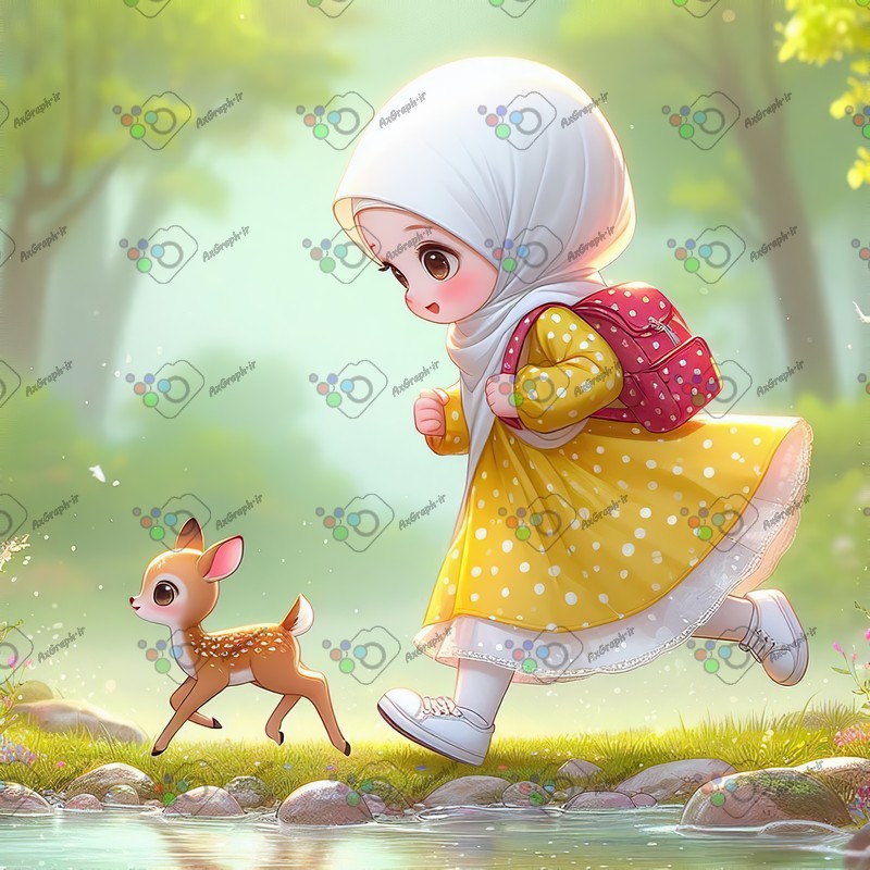 بک گراند کودکانه دختر بچه ناز با حجاب و بچه آهو در حال دویدن-کد 44384(ویژه عکس گراف)