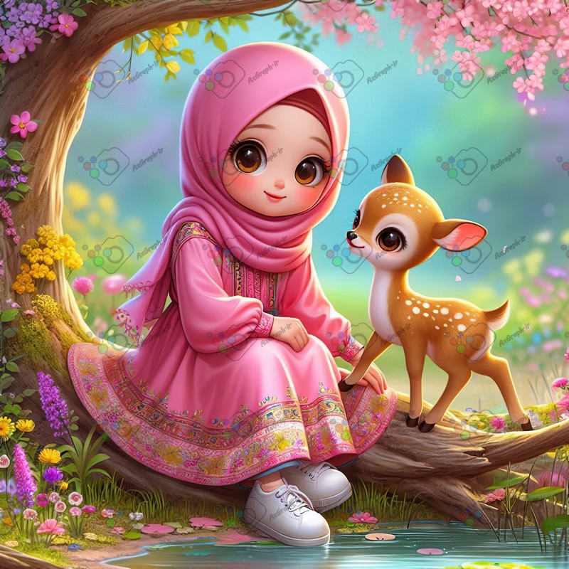 بک گراند کودکانه دختر بچه ناز با حجاب و بچه آهو نشسته روی درخت-کد 44386(ویژه عکس گراف)