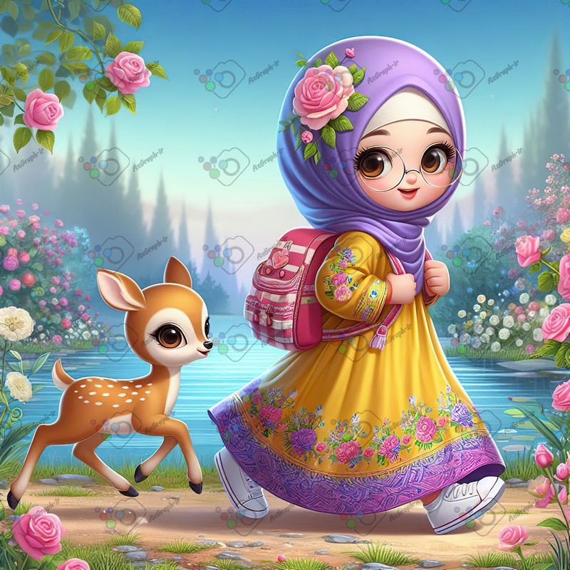 بک گراند کودکانه دختر بچه ناز با حجاب و بچه آهو در حال عبور از میان گلها-کد 44388(ویژه عکس گراف)