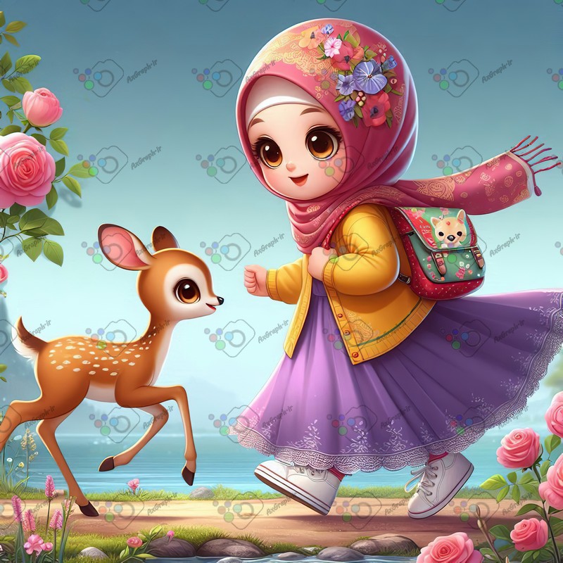 بک گراند کودکانه دختر بچه ناز با حجاب و بچه آهوی ناز در حال بازی-کد 44390(ویژه عکس گراف)