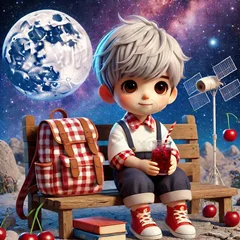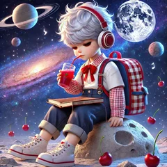 بک گراند کودکانه پسر کوچولوی دانش آموز نشسته روی تخته سنگ فضایی در حال نوشیدن آب آلبالو-کد 44243(ویژه عکس گراف)