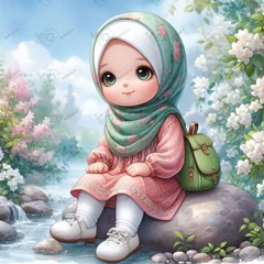 بک گراند کودکانه دختر کوچولوی ناز با حجاب با کوله پشتی نشسته روی تخته سنگ-کد 44248(ویژه عکس گراف)