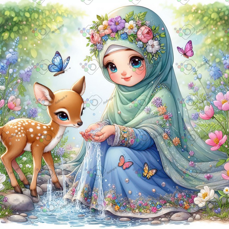 بک گراند کودکانه دختربچه ناز با حجاب در حال آب دادن به آهوی کوچک در باغ زیبا-کد 44830(ویژه عکس گراف)