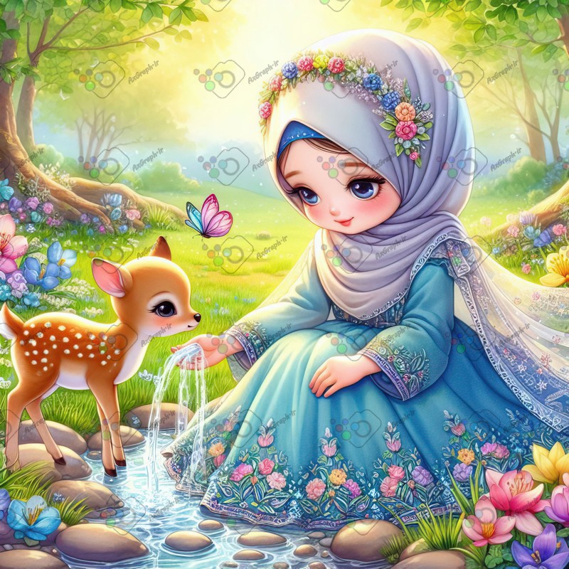 بک گراند کودکانه دختربچه ناز با حجاب در حال آب دادن به بچه آهو در باغ گلها-کد 44826(ویژه عکس گراف)