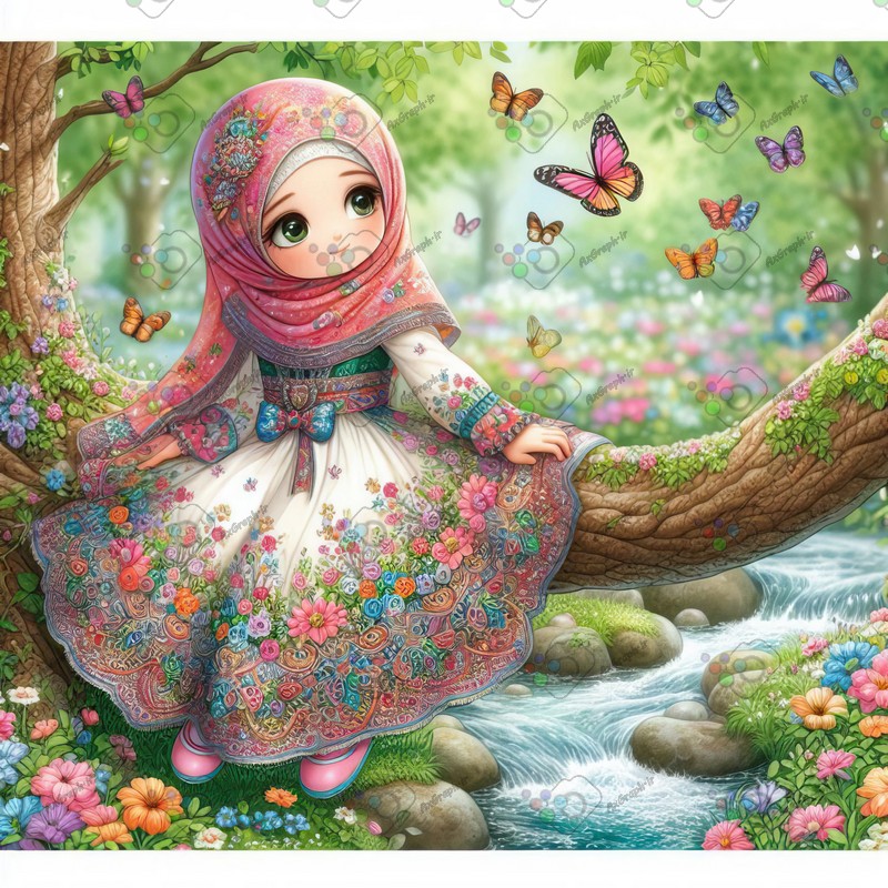 بک گراند کودکانه دختربچه ناز با حجاب نشسته روی درخت در حال تماشای پروانه ها-کد 44827(ویژه عکس گراف)