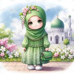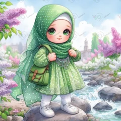 بک گراند کودکانه دختر کوچولوی ناز با حجاب با لباس خال خالی سبز استاده روی تخته سنگ-کد 44247(ویژه عکس گراف)