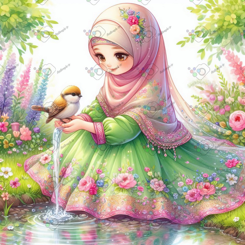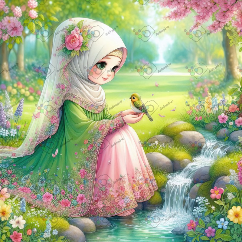 بک گراند کودکانه دختربچه ناز با حجاب و گنجشک تپلو کنار چشمه در باغ گل-کد 44828(ویژه عکس گراف)