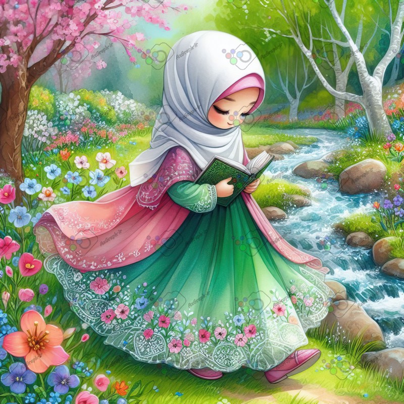 بک گراند کودکانه دختربچه ناز با حجاب در حال مطالعه و قدم زدن کنار رود-کد 44824(ویژه عکس گراف)