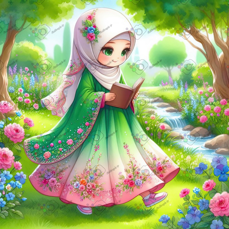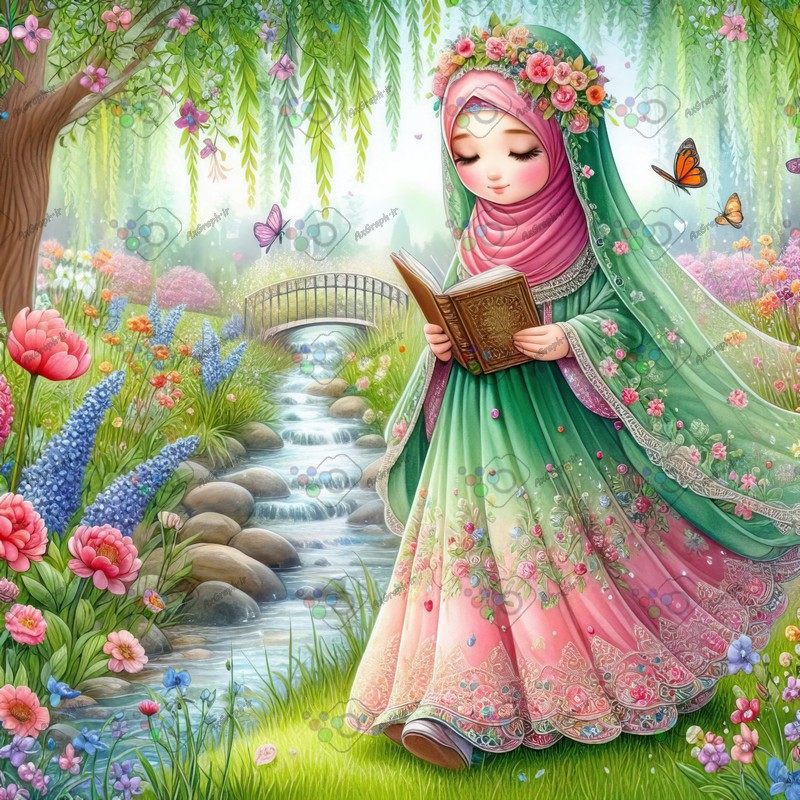 بک گراند کودکانه دختربچه ناز با حجاب در حال مطالعه و عبور از باغ گلها-کد 44823(ویژه عکس گراف)