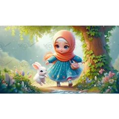 بک گراند کودکانه دختر کوچولوی ناز با حجاب و خرگوش تپلو در حال دویدن-کد 44241(ویژه عکس گراف)